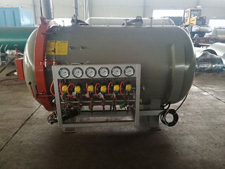 在工作的過程中罐內會有抽真空的步驟,一般來講該設備都是多路抽真空的,罐外可以看到有著一排的真空表進行每一個管路進行抽真空,我們為了讓壓力達到我們想要的結果還要對罐內進行加壓,壓力作用于制品上這樣就能更快的滲透和固化使得整個熱壓固化過程加速,一般來說現在的熱壓罐都是高壓熱壓罐。